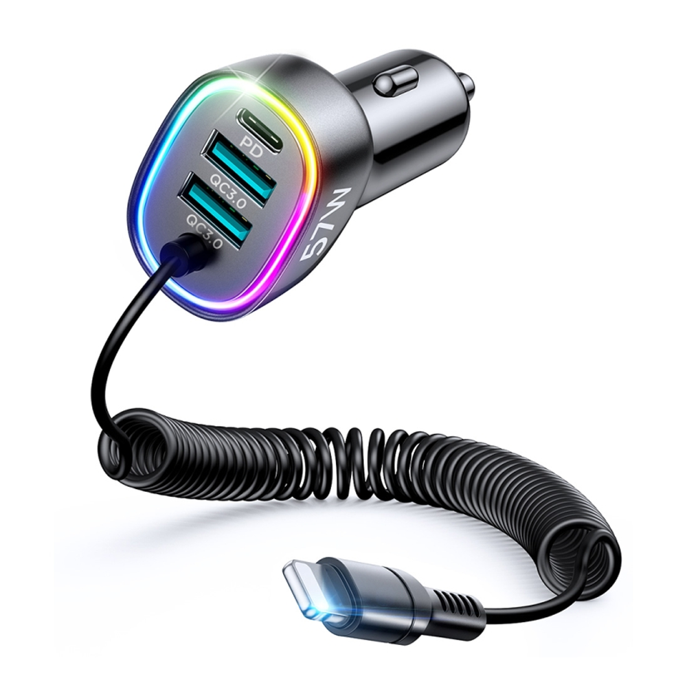 JOYROOM JRCL20 57W 4in1 Car Charger with Coiled Lightning Cable Black